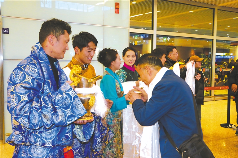 這個舉動,讓來自云南、廣東、安徽等地的100多名游客切身體驗了一番別具西藏特色的歡迎儀式?!皼]想到一下飛機就感受到了藏族同胞們的熱情,身體的疲憊感瞬間消散了?!睆V東游客彭帆開心地說道。