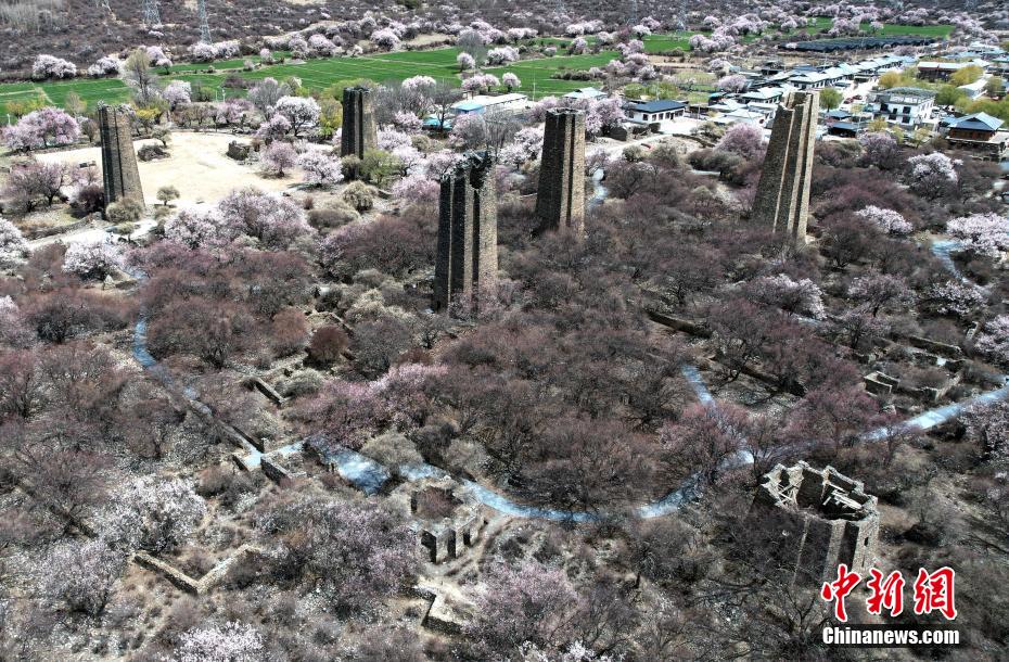 秀巴古堡位于西藏林芝市工布江達縣,是古代的軍事設施,距今已有1600多年的歷史。時下,古堡之下遍布的桃花競相綻放,粉白桃花點綴著滄桑古堡,景色壯麗。圖為4月5日,秀巴古堡群下桃花綻放。(無人機照片)中新社記者 李林 攝