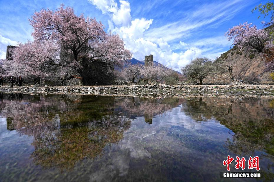 秀巴古堡位于西藏林芝市工布江達縣,是古代的軍事設施,距今已有1600多年的歷史。時下,古堡之下遍布的桃花競相綻放,粉白桃花點綴著滄桑古堡,景色壯麗。圖為4月5日,游客在秀巴古堡下拍照。中新社記者 李林 攝