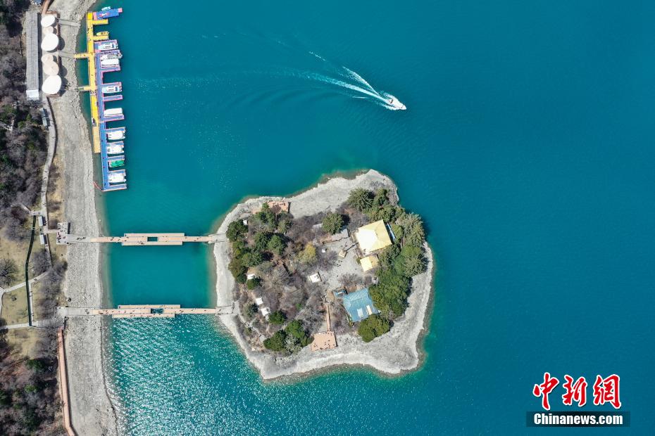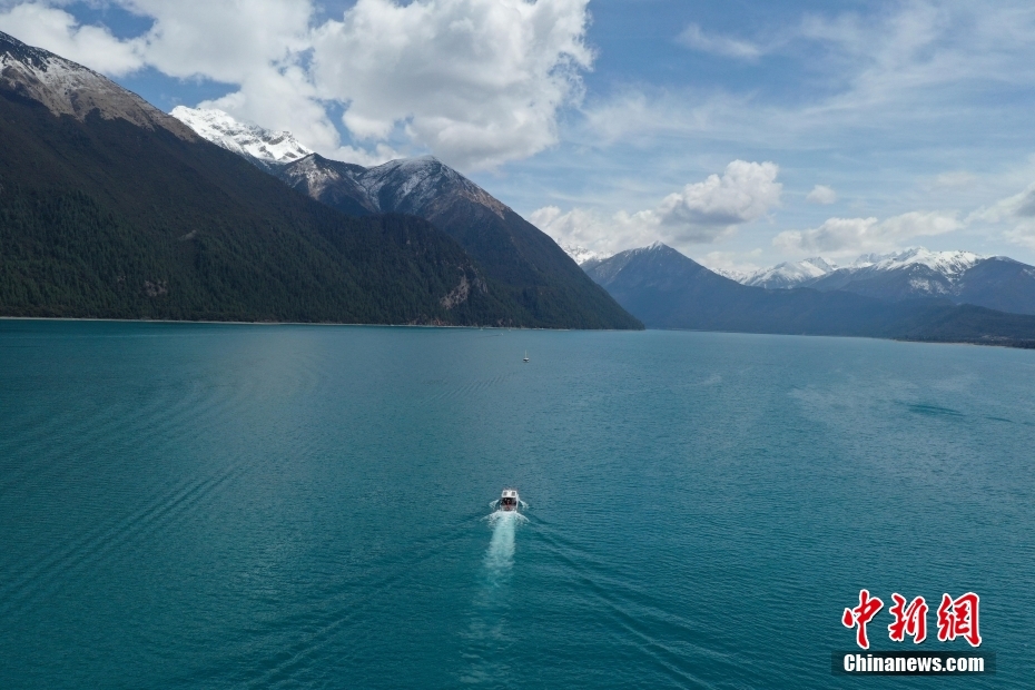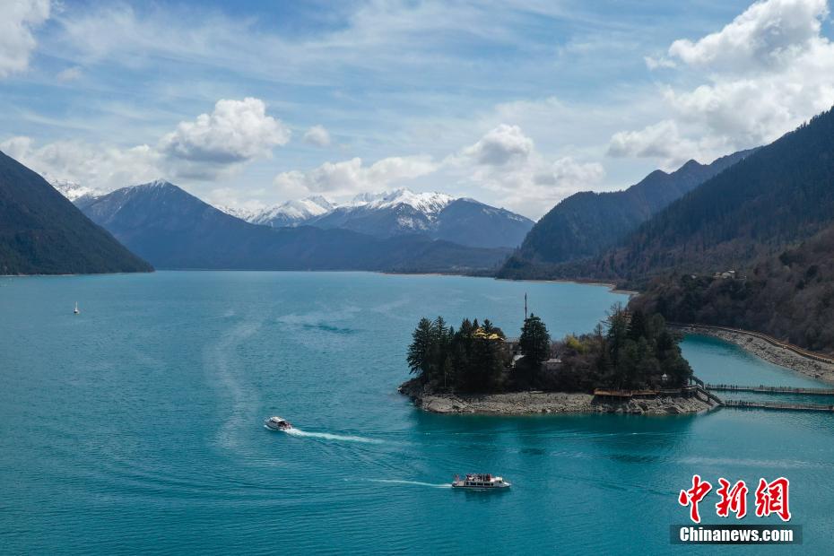4月6日,西藏林芝工布江達縣巴松措景區(qū)游人如織。春日里,湛藍(lán)湖水與巍峨雪山相映成趣,游客游玩湖心島或乘船游覽,沉醉在這湖光山色中。圖為巴松措里的游船。(無人機照片)中新社記者 貢嘎來松 攝