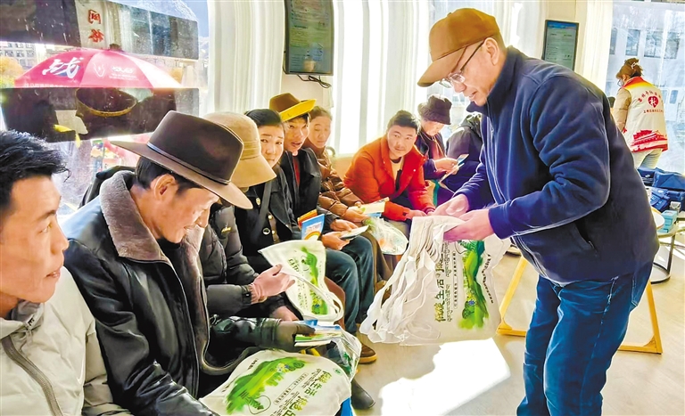 圖為工布江達(dá)縣社區(qū)工作人員向群眾發(fā)放宣傳品。