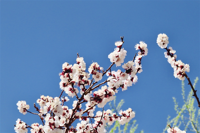 路邊的榆葉梅率先吐蕊,粉白的花朵簇?fù)碓谥︻^,遠(yuǎn)看如粉白的云朵飄浮在街道兩側(cè)。沿著道路慢慢走,幾株桃樹穿插在其中,深紅淺粉交錯(cuò),以藍(lán)天為背景,舉起手機(jī)隨手一拍都是高清壁紙級(jí)別的美景。陽光正好時(shí),能看到在花樹下曬太陽的老奶奶,她們?yōu)檫@浪漫的春日景色增添了一絲生活的氣息。