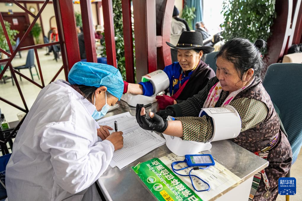 4月25日,在那曲市色尼區(qū)老年人日間照料中心,老人在測量血壓。新華社記者 丁增尼達(dá) 攝
