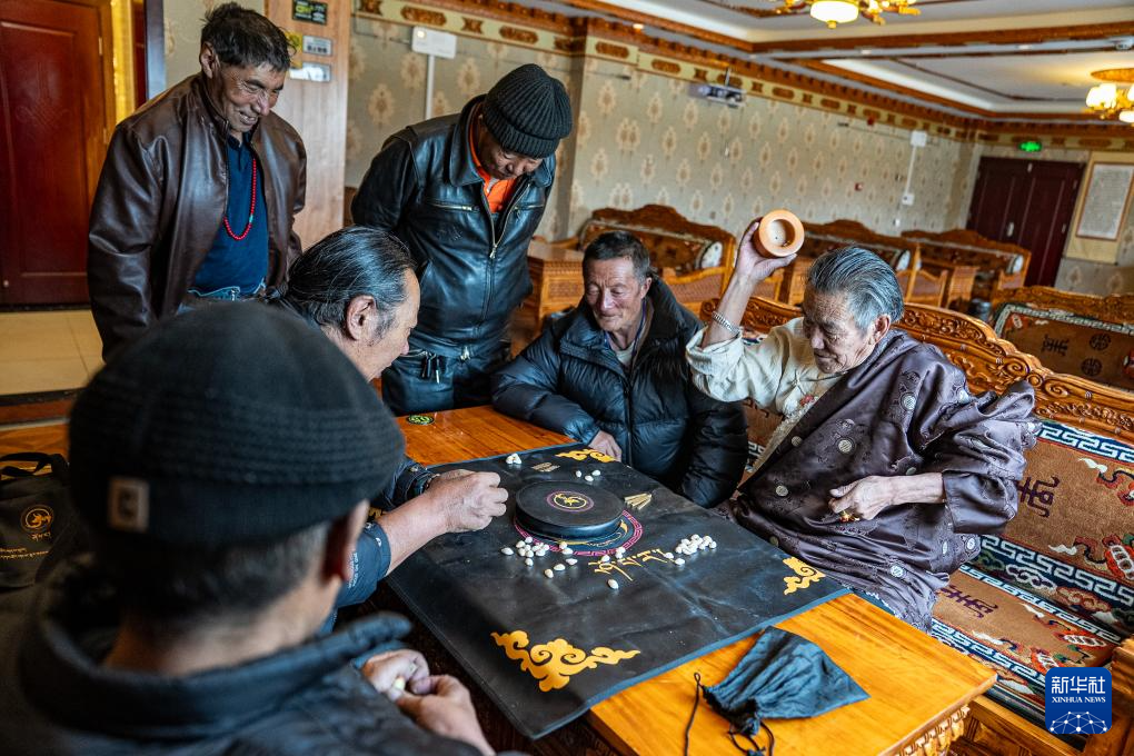 4月25日,老人們在那曲市色尼區(qū)老年人日間照料中心玩藏式骰子。新華社記者 丁增尼達(dá) 攝