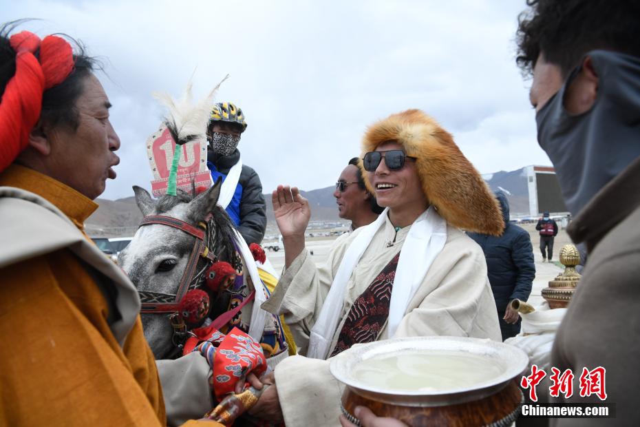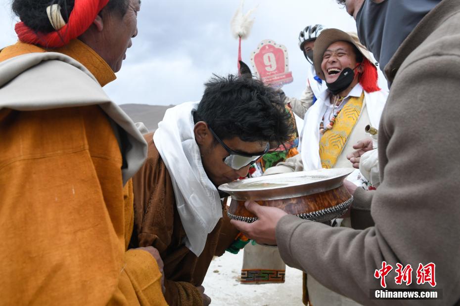 圖為頒獎(jiǎng)儀式上馬主喝青稞酒慶祝。中新社記者 貢嘎來松 攝