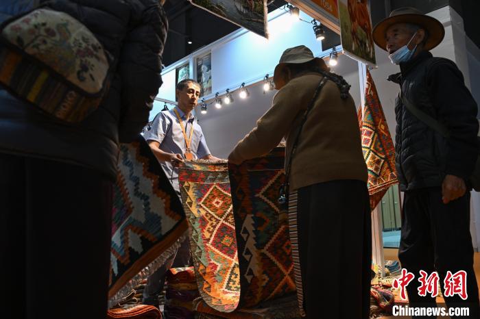 圖為拉薩進(jìn)口商品展覽會(huì)現(xiàn)場(chǎng),伊朗商人(左)向顧客介紹、推銷毛毯。中新社記者 貢嘎來松 攝