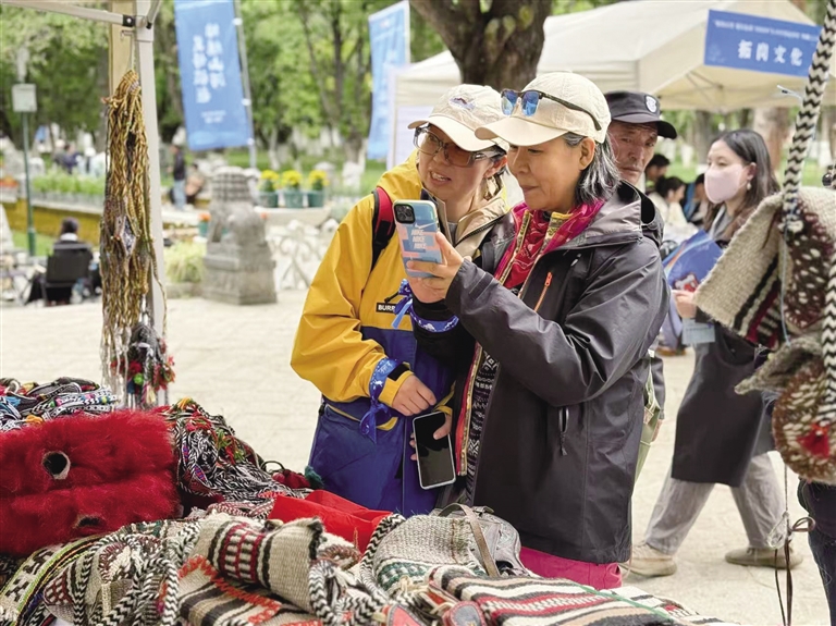 在西藏“非遺”文化體驗(yàn)區(qū),來(lái)自湖南的游客張麗一邊挑選包包一邊感嘆:“哇噻,真的太神奇了!沒(méi)想到牦牛毛還可以做成這么漂亮的包包,我要多買(mǎi)幾個(gè)帶回去給朋友。還能把這份獨(dú)特的文化記憶帶回家。”