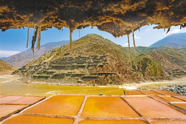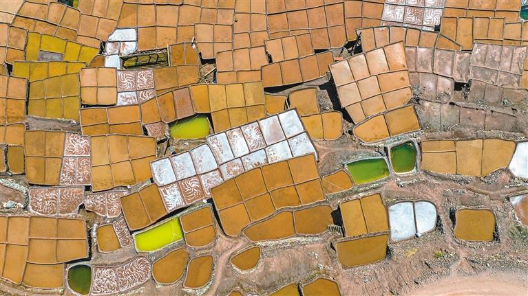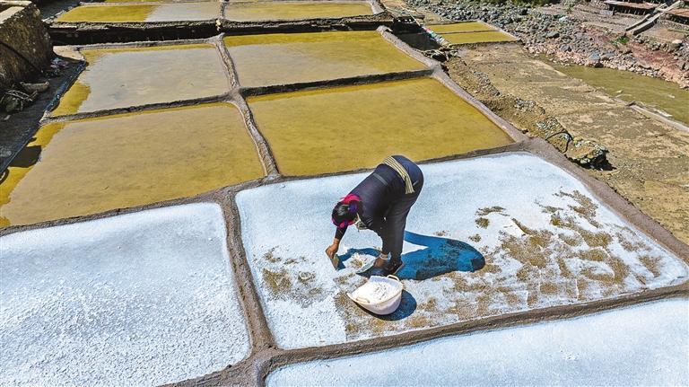 鹽田里,60歲的乃柯正和丈夫一起用木拍夯實(shí)鹽田?!艾F(xiàn)在用泵抽水輕松多了,但拍鹽田的手藝不能丟。”老人的話語(yǔ)中,既有對(duì)科技的接納,也有對(duì)傳統(tǒng)的堅(jiān)守。鹽田下方,鹽晶垂落成簾,在山風(fēng)拂動(dòng)下閃爍微光,仿佛在訴說(shuō)著什么。一塊塊鹽田如同一面面鏡子,既映照出千年文明的厚重,也折射著鄉(xiāng)村振興的希望。當(dāng)鹽民們輕掃鹽田,他們掃的不僅是晶瑩的鹽,更是一份在傳承與創(chuàng)新中守護(hù)的鄉(xiāng)愁。