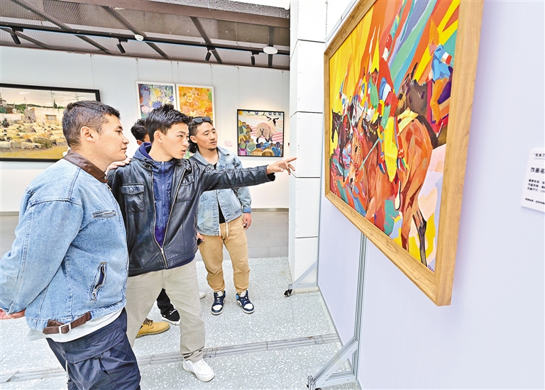 拉薩市首屆當(dāng)代女畫家美術(shù)聯(lián)展在西藏非遺博物館開幕,市民群眾正在觀展。