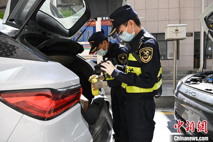 圖為西藏自治區(qū)日喀則市吉隆縣的吉隆口岸,海關(guān)工作人員在對(duì)出口的國(guó)產(chǎn)新能源汽車進(jìn)行檢查。貢嘎來松 攝