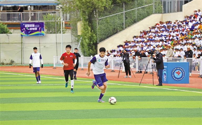 以球?yàn)槊剑扒颉蓖妗罢x”。5月20日下午,中國日喀則市珠峰雪鷹隊(duì)與阿根廷薩爾塔普納隊(duì)在日喀則市上海實(shí)驗(yàn)學(xué)校體育場上演了一場跨越山海的青少年足球友誼賽。賽場上,雙方球員迅速進(jìn)入狀態(tài),團(tuán)結(jié)配合、積極拼搶,用細(xì)膩的腳法,或急停、或變向、或假動(dòng)作,輕松晃過對手,射門得分,給觀眾呈現(xiàn)了一場精彩的足球比賽。