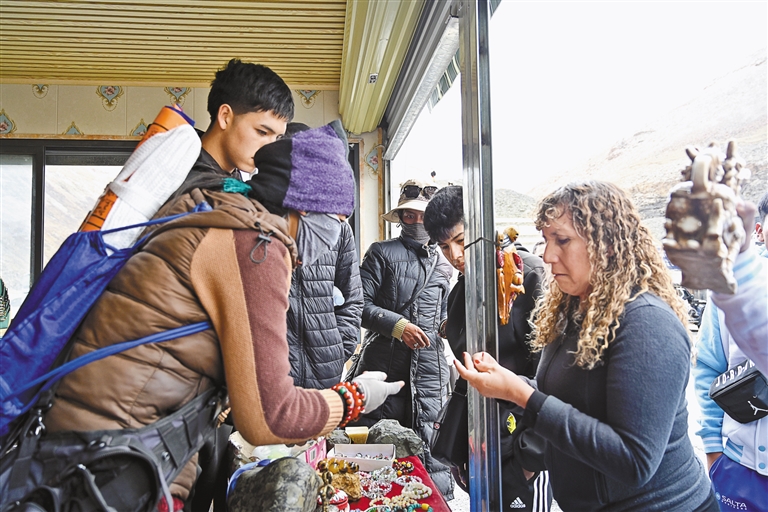 新奇感過后,游客們開啟購物模式?!鞍⒓?,這個(gè)掛飾可以定制嗎?”“你們可以發(fā)快遞嗎?”對于一連串的問題,阿佳格桑忙碌地一一回答著,“你們想要什么圖形,我們就給你定制什么圖形?!薄拔覀冞@兒快遞很快,今天下單明天就給你發(fā)!”短短半個(gè)小時(shí),“阿佳格桑工坊”的生意火爆,銷售藏式靠墊、藏式地毯、掛飾等特色產(chǎn)品4000多元?!盎厝ズ螅乙ㄟ^自媒體平臺,宣傳這次西藏之旅的所見所聞,讓更多親朋好友來西藏旅游!”日本游客琴音有感而發(fā)。