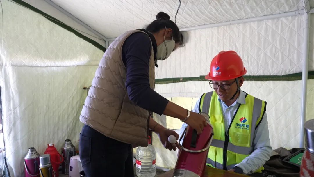 茶館主人巴桑,是村里有名的熱心人??粗┕と藛T為重建家園奔波,采購物資不便,她果斷在項目部生活區(qū)旁開起小賣鋪。與工人們熟絡(luò)后,她又搬來桌椅,搭起簡易帳篷茶館,只為給異鄉(xiāng)人一個歇腳放松之處。