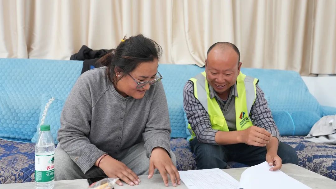 飯后,大家迅速投入工作,“拉巴家的房子地圈梁模板做完了嗎?”普布普尺邊詢問,邊認(rèn)真記錄。祝波耐心細(xì)致地介紹每一戶的施工情況。這個00后的小姑娘,在近幾個月與祝波的相處中,能力不斷提升,兩人在工作中配合默契,宛如老搭檔。
