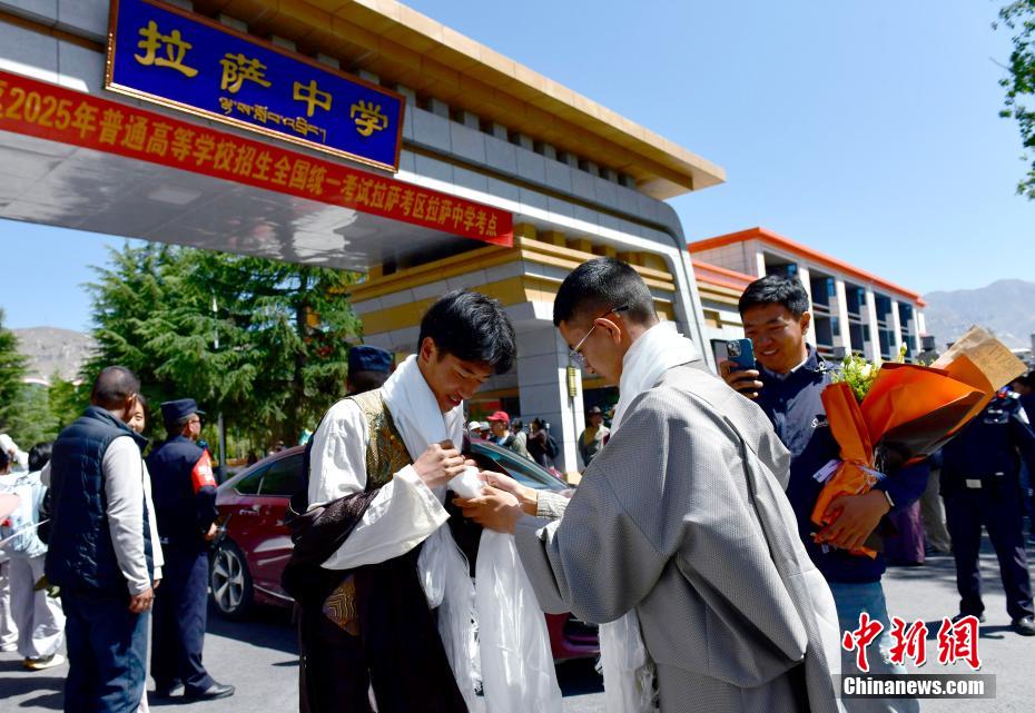 6月9日,西藏拉薩江蘇實(shí)驗(yàn)中學(xué)考點(diǎn)外親友為考生送上哈達(dá)。當(dāng)日,西藏自治區(qū)2025年普通高考完成所有科目考試,2025年西藏高考落下帷幕。中新社記者 貢嘎來松 攝