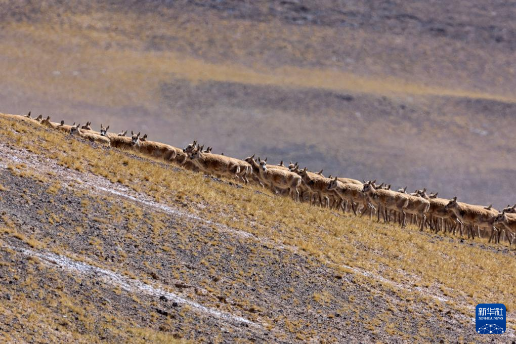 羌塘國家級自然保護(hù)區(qū)核心區(qū)繁殖遷徙路上的雌性藏羚羊群。(6月10日攝)。新華社記者 姜帆 攝