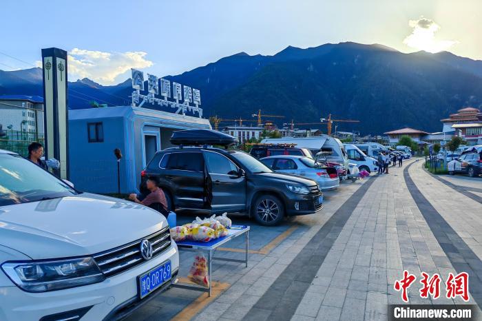6月26日傍晚,西藏林芝宇拓公園自駕露營地內停放著來自中國各地的進藏車輛,該營地設有兩處公共廚房和浴室,方便自駕游客休整。中新社記者 江飛波 攝