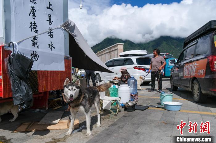 6月29日,西藏林芝宇拓公園自駕露營地的哈士奇,它跟隨主人乘電動三輪車進藏。中新社記者 江飛波 攝