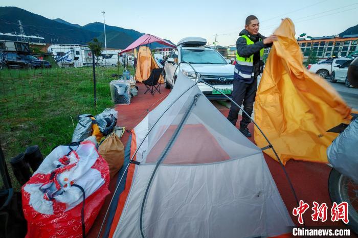 6月26日,摩旅理發(fā)師李秋實到達西藏林芝宇拓公園自駕露營地,搭建帳篷準備過夜。中新社記者 江飛波 攝