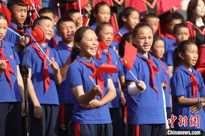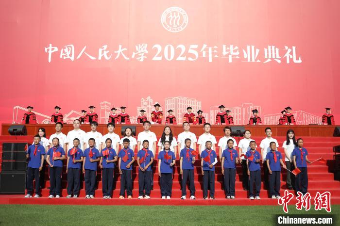 6月23日,中國人民大學2025年畢業(yè)典禮現(xiàn)場,措果鄉(xiāng)中心小學的孩子們與人大畢業(yè)生們小手牽大手,相伴而立,共同唱響了《萬疆》。主辦方供圖