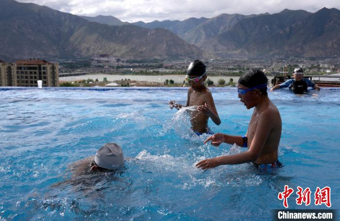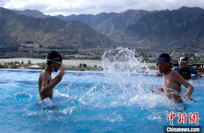 7月5日,西藏拉薩市一泳池內(nèi),不少市民帶著孩子來到泳池戲水,享受夏日清涼。圖為小朋友在泳池里游泳。中新社記者 李林 攝