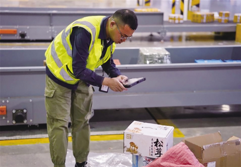 保障松茸運(yùn)輸現(xiàn)場(chǎng)。記者 張雪芳 攝