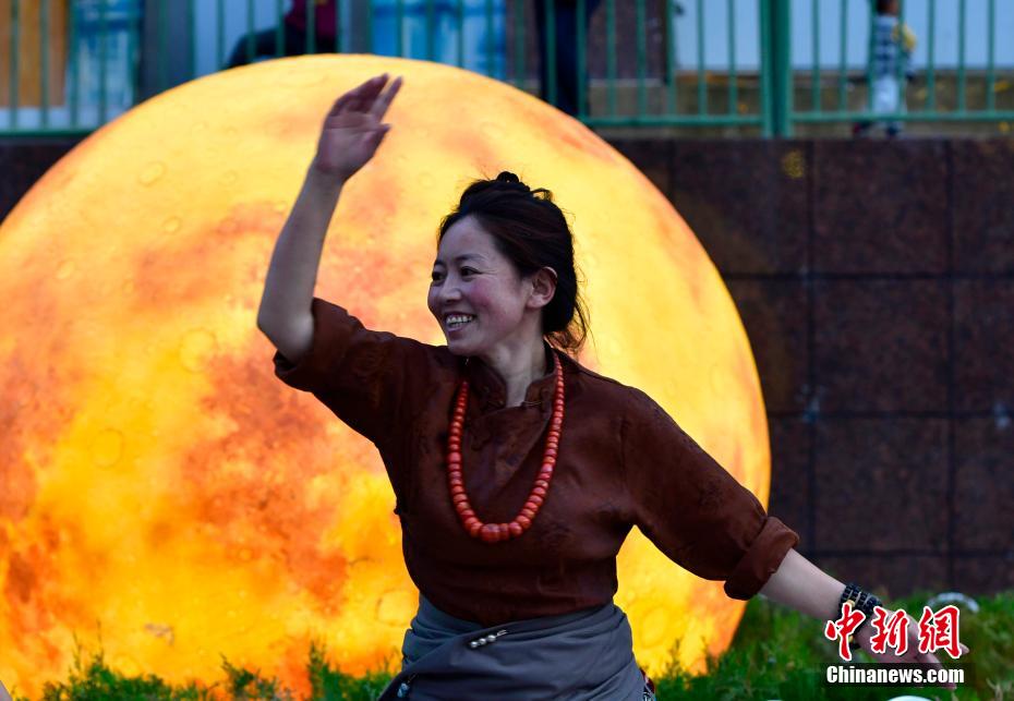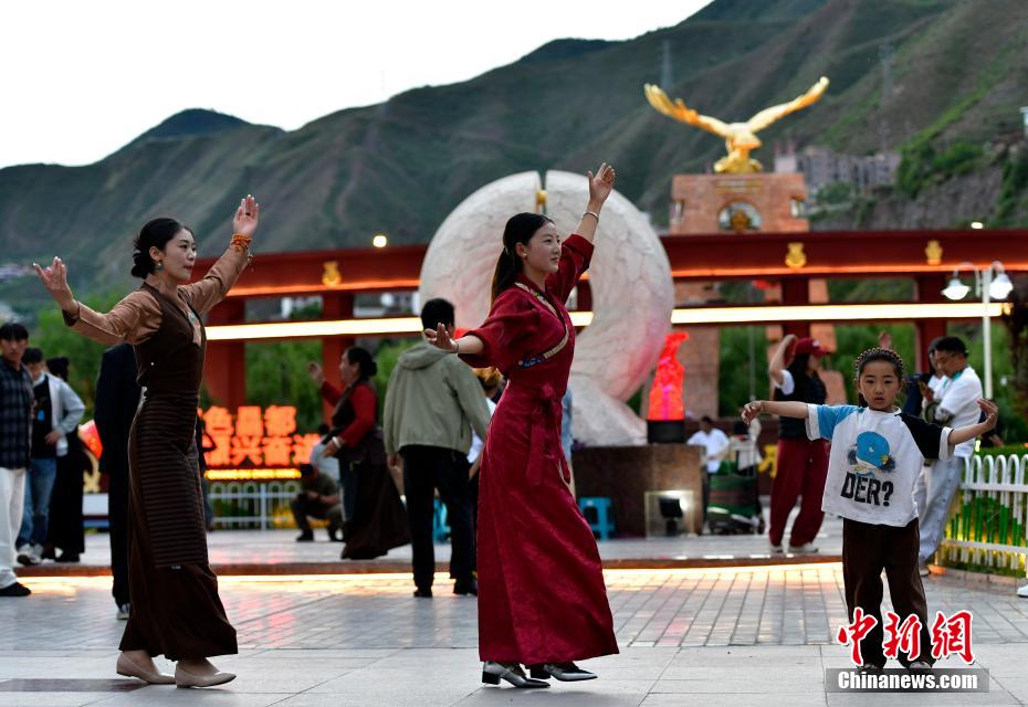 7月13日,西藏昌都瀾滄江天津廣場(chǎng)上,鍋莊舞愛好者踏歌起舞,舞出夏日夜間精彩。中新社記者 李林 攝