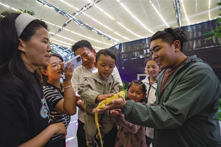 扎囊縣西普休閑觀光農(nóng)業(yè)發(fā)展有限公司建設(shè)的海洋館內(nèi)小孩正在與蜥蜴互動。