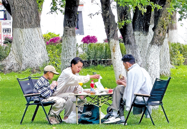 正在過林卡的拉薩市民尼珍告訴記者:“我們是自帶折疊椅、食物和茶具,在河邊搭帳篷、過林卡,喝著熱騰騰的酥油茶,看著藍(lán)天白云倒映在清澈的溪水中,這種愜意難以用言語形容?!?/p>