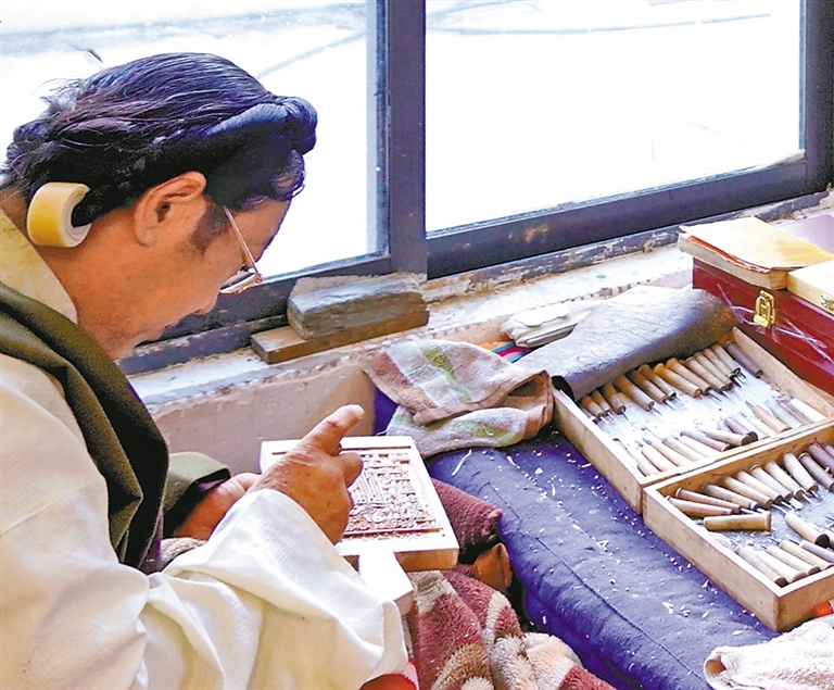 圖為波羅古澤木刻技藝非遺傳承人澤培在雕刻。記者 袁海霞 攝