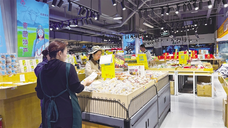 除了家電賣場(chǎng),特產(chǎn)超市也迎來了消費(fèi)熱潮。在位于拉薩市濱河路乃倉(cāng)廣場(chǎng)負(fù)一樓的藏匯倉(cāng)·西藏特產(chǎn)倉(cāng)儲(chǔ)超市(乃倉(cāng)總店),前來選購(gòu)特產(chǎn)的消費(fèi)者絡(luò)繹不絕,貨架前時(shí)常排起長(zhǎng)隊(duì)。該超市負(fù)責(zé)人李紅容笑著說:“今年上半年的客流量和銷售額都比去年同期上漲了不少,像牦牛肉干、藏香、青稞制品這些特色產(chǎn)品特別受歡迎。一方面是本地市民買回去自己吃或者送給外地朋友;另一方面很多游客也會(huì)專門過來采購(gòu),把西藏的味道帶回去?,F(xiàn)在物流方便,我們還開通了快遞直發(fā)服務(wù),不少消費(fèi)者在線上下單,店里的線上訂單量每個(gè)月都在增加。為了滿足消費(fèi)者需求,我們還增加了產(chǎn)品種類,光是青稞制品就有青稞餅干、青稞麥片、青稞酒等二十多個(gè)品種?!?/p>