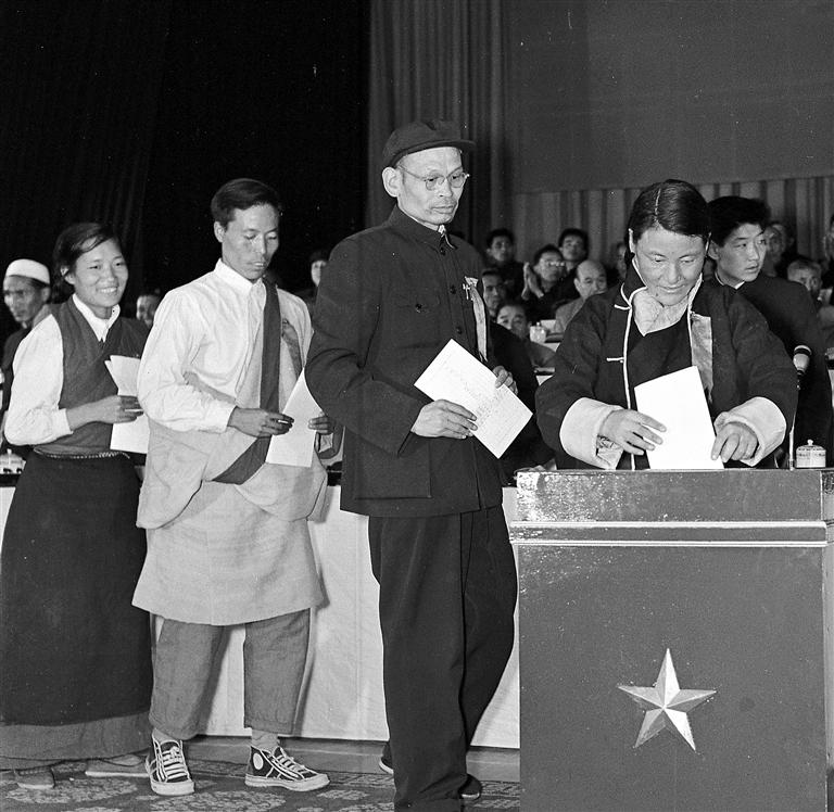 圖為代表們在西藏自治區(qū)第一屆人民代表大會上投票(1965年攝)。