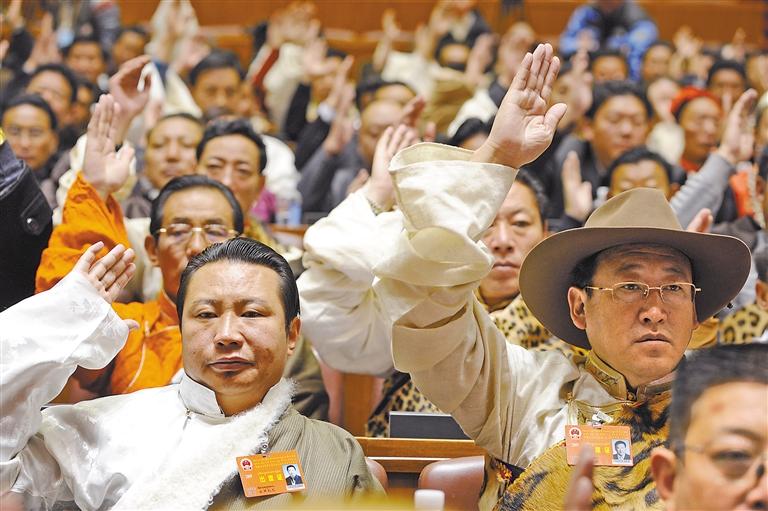 在舊西藏,占總?cè)丝诓坏?%的三大領(lǐng)主(官家、貴族和寺院上層僧侶)占有全部生產(chǎn)資料,而占總?cè)丝?5%以上的農(nóng)奴和奴隸沒有人身自由。西藏民主改革特別是西藏自治區(qū)成立以來,民族區(qū)域自治制度得到堅(jiān)決貫徹,各族人民參與民主政治建設(shè)的熱情持續(xù)高漲:農(nóng)奴的后代當(dāng)選人大代表,通過人民代表大會制度參與國家治理;截至目前,全區(qū)四級人大代表42000余人中,藏族和其他少數(shù)民族約占89%;門巴、珞巴等人口不足萬人的民族,在全國及西藏人大均有代表——雪域高原各族兒女依法行使民主權(quán)利,真正成為命運(yùn)的主宰者。