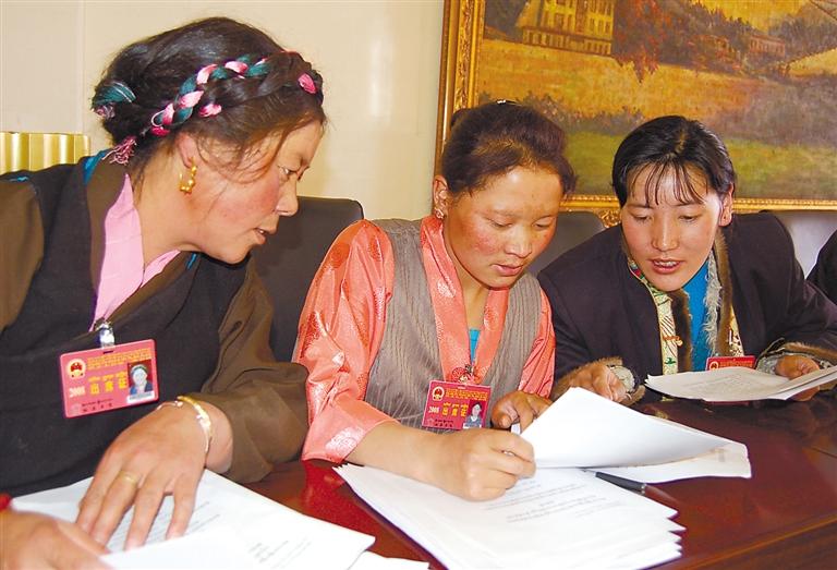 圖為西藏自治區(qū)九屆人大一次會議期間,來自拉薩市的格桑卓嘎、洛桑卓嘎、梅朵卓瑪三位代表一起審議政府工作報(bào)告(2008年攝)。
