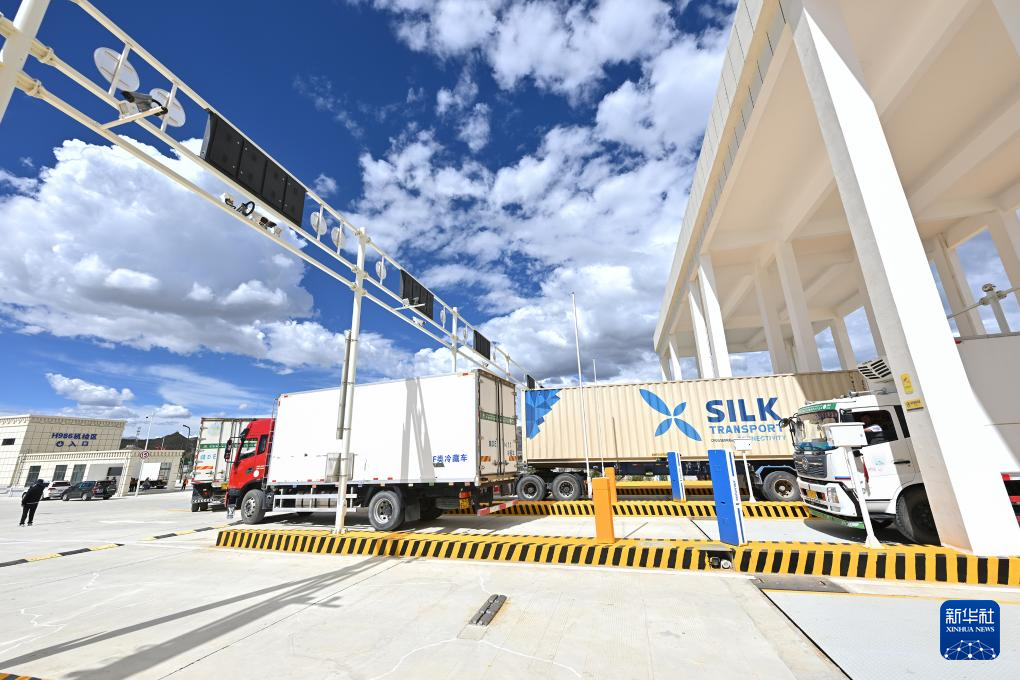 7月16日,貨車通過日喀則國際陸地港出口貨物查驗(yàn)場卡口。新華社記者 李鑫 攝