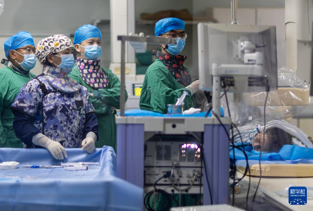 協(xié)和醫(yī)院第十批援藏醫(yī)生王強(左四)、第十一批援藏醫(yī)生蔣青偉(左三)和西藏自治區(qū)人民醫(yī)院醫(yī)生扎西(左一)在拉薩為患者施行內(nèi)鏡逆行胰膽管造影術(8月5日攝)。新華社記者 姜帆 攝