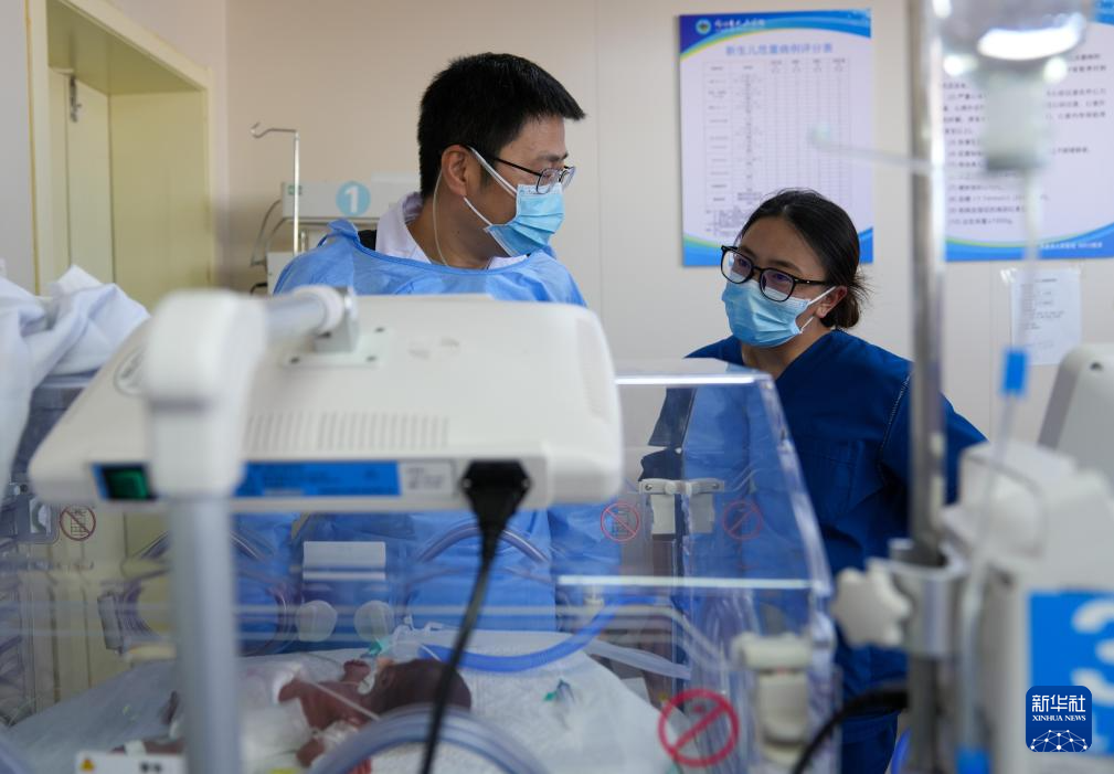 在那曲市人民醫(yī)院新生兒重癥監(jiān)護室,來自大連醫(yī)科大學附屬第一醫(yī)院的援藏醫(yī)生田聰亮(左)和護士旦珍合作為一名早產(chǎn)兒實施機械通氣治療(7月18日攝)。新華社記者 晉美多吉 攝