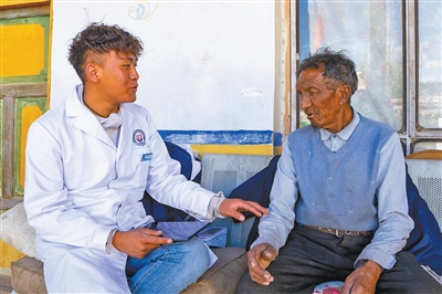 走進(jìn)大門,他一邊和老人寒暄,一邊從包里拿出血壓計(jì)?!斑@兩個(gè)月血壓變化不大,咱們還要繼續(xù)保持健康生活習(xí)慣,不要吃太多油鹽。”量完血壓,索朗丹增細(xì)細(xì)叮囑。