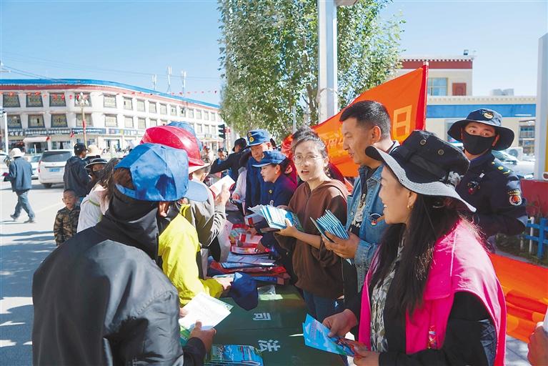 圖為那曲市索縣各普法成員單位工作人員為過往群眾發(fā)放生態(tài)環(huán)保相關(guān)宣傳資料。本報(bào)通訊員 益西卓嘎 攝
