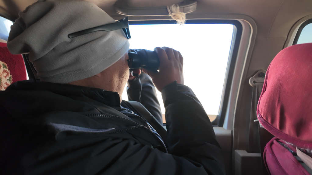 為了拍下野保員的日常工作以及藏羚羊大遷徙的宏大場(chǎng)面,我們一行跟隨巡護(hù)車(chē),向著保護(hù)區(qū)核心區(qū)進(jìn)發(fā)。路面逐漸從“蜿蜒崎嶇的溪流”變成“波濤洶涌的大?!?,越野車(chē)內(nèi)好像一個(gè)迪斯科舞池,每一件東西都像被賦予了生命一般蹦蹦跳跳,伴隨著我們這些乘客的驚呼,連同引擎的轟鳴一起,揉碎在無(wú)邊荒原的呼嘯風(fēng)聲中。