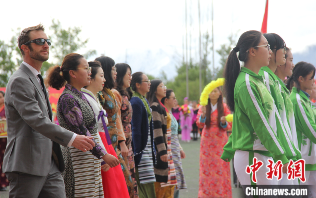 2017年5月11日,西藏大學(xué)舉行第二十八屆田徑運(yùn)動會,數(shù)十名外籍留學(xué)生和外籍教師參加了開幕式。圖為開幕式中旅游與外語學(xué)院方隊(duì) 劉蔭 攝