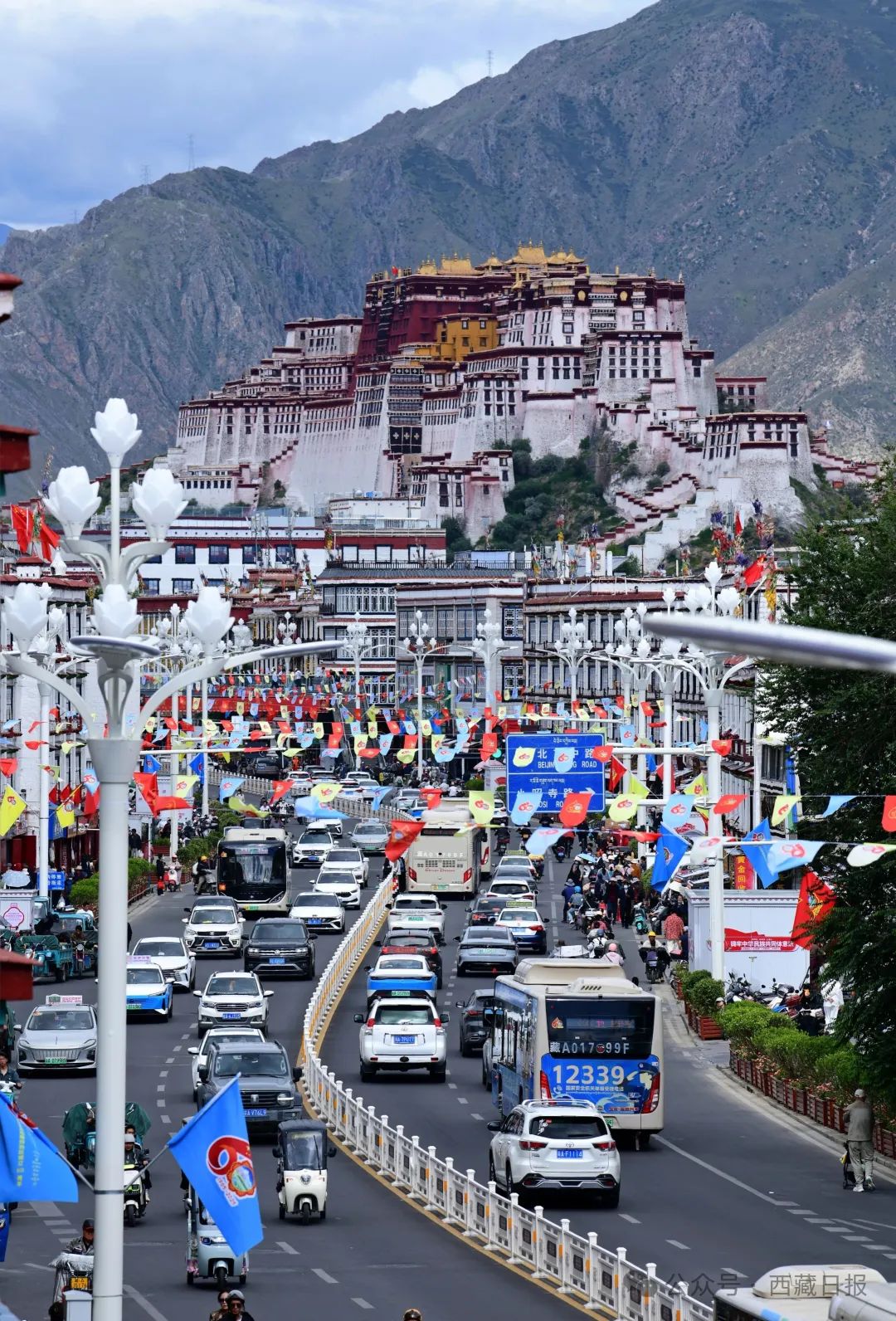 圖為彩旗飄揚(yáng)、裝飾一新的拉薩市北京中路。記者 唐斌 洛桑 攝