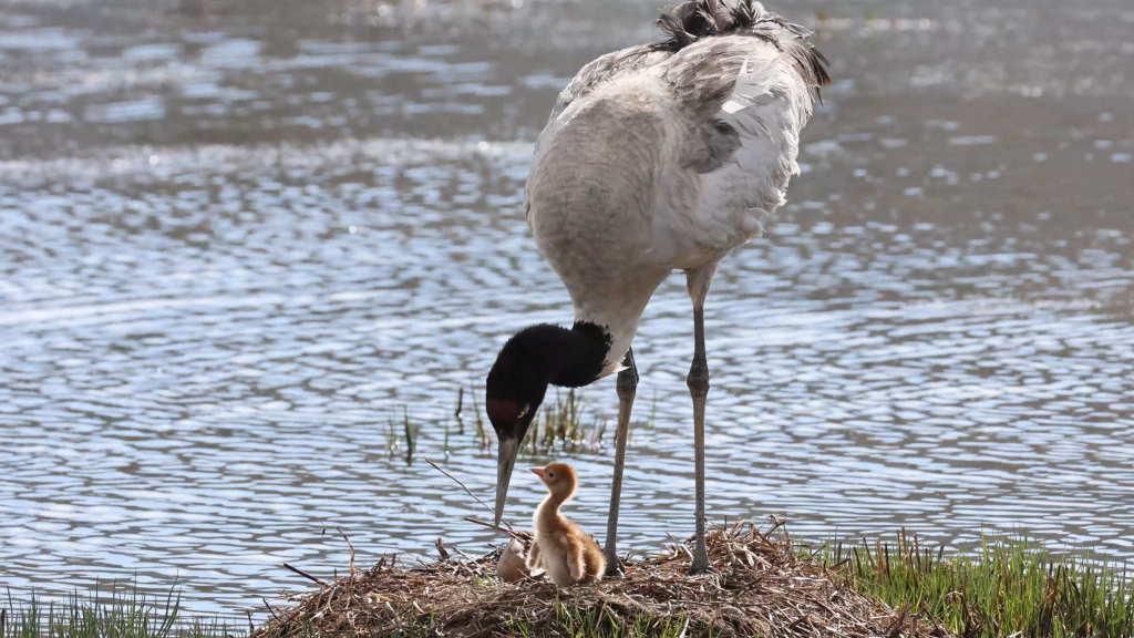 說到這里,次成塔青突然轉(zhuǎn)過身,看向高高麗麗和它們的孩子。開始下雨了,水面上鋪滿了細(xì)密的漣漪,而在濕地中央那一個(gè)不大的巢上,是一動(dòng)不動(dòng)、用身子緊緊護(hù)住孩子的黑頸鶴??粗@一幕,風(fēng)雨似乎也沒有那么刺骨了……