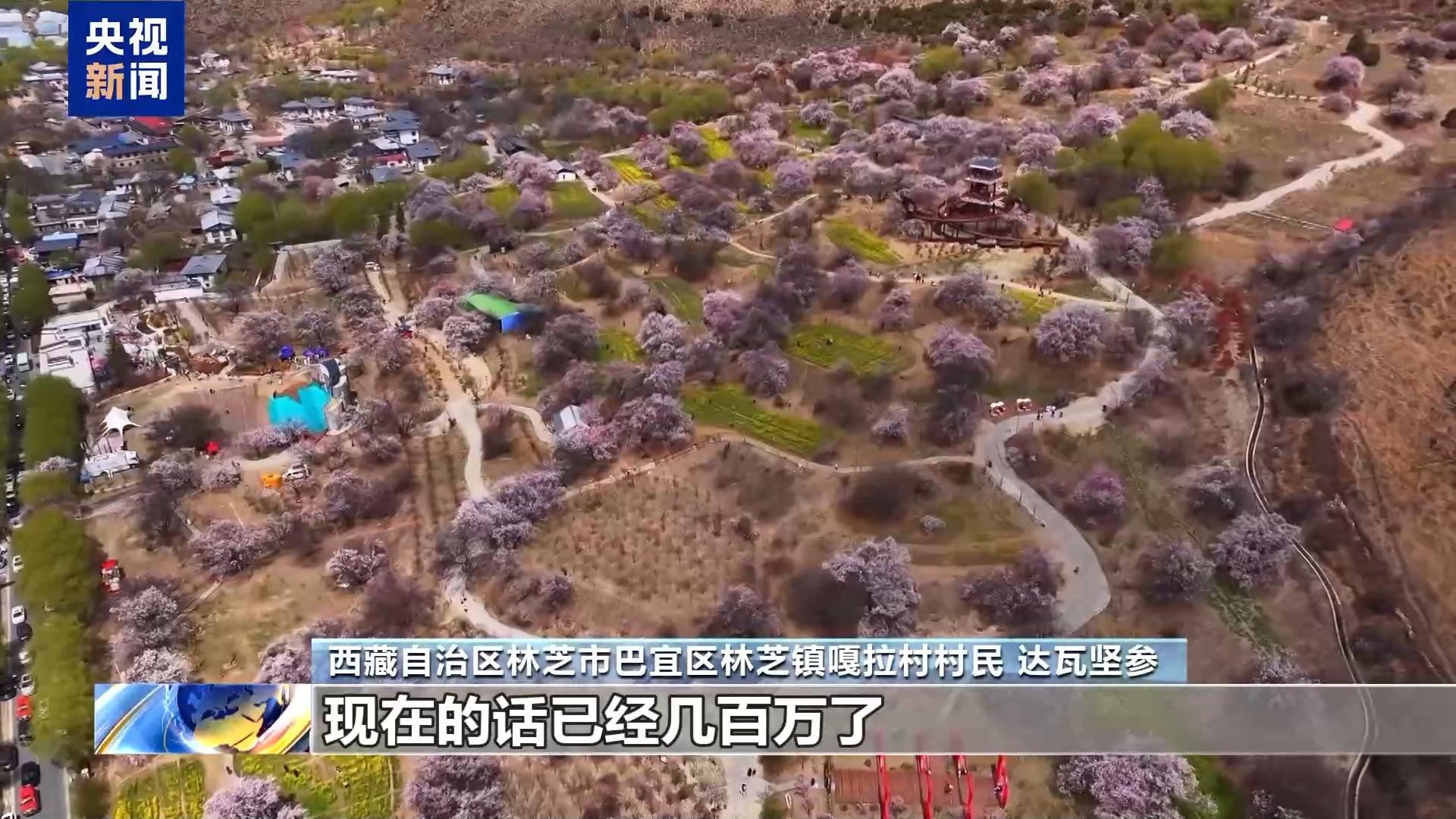 西藏自治區(qū)林芝市巴宜區(qū)林芝鎮(zhèn)嘎拉村村民 達(dá)瓦堅(jiān)參:以前從桃花節(jié)開始搞起來的時候,全村收入幾百塊錢到幾千塊錢到幾萬塊錢,現(xiàn)在的話已經(jīng)幾百萬了。