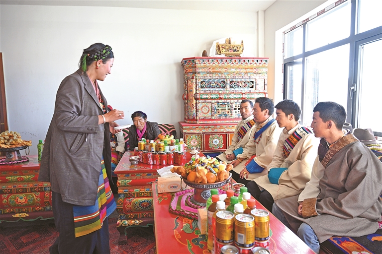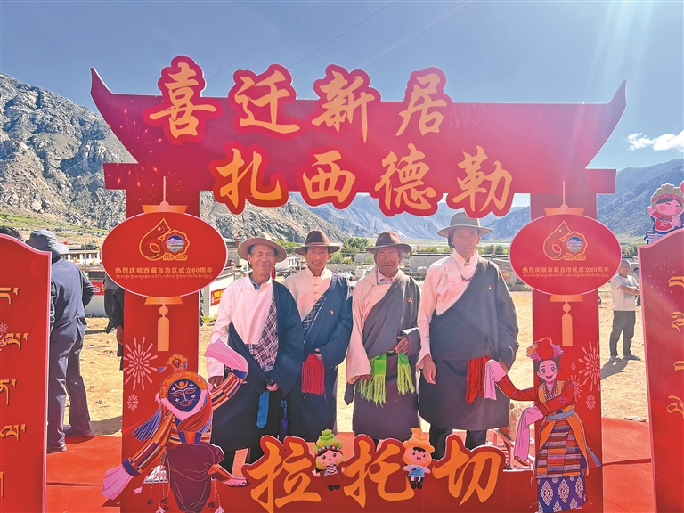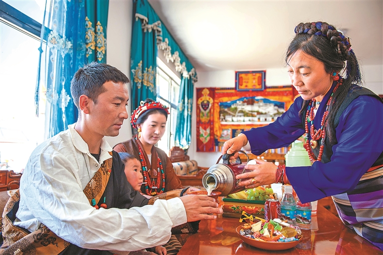 拉孜縣錫欽鄉(xiāng)夏拉蘇村群眾搬新家、品美酒。拉孜縣融媒體供圖