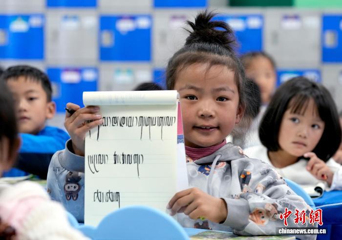 9月1日,拉薩市第一小學(xué)一年級(jí)二班的學(xué)生展示在藏語(yǔ)文課上書(shū)寫(xiě)的藏文。近日,西藏拉薩市秋季學(xué)期開(kāi)學(xué),各項(xiàng)教學(xué)工作有序開(kāi)展。中新社記者 李林 攝