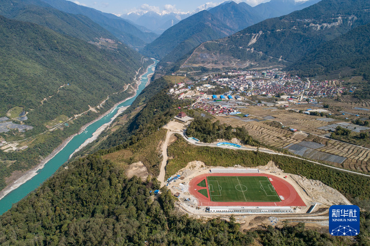 墨脫縣的11人制足球場位于雅魯藏布江邊(2021年2月13日攝,無人機照片)。新華社記者 孫非 攝