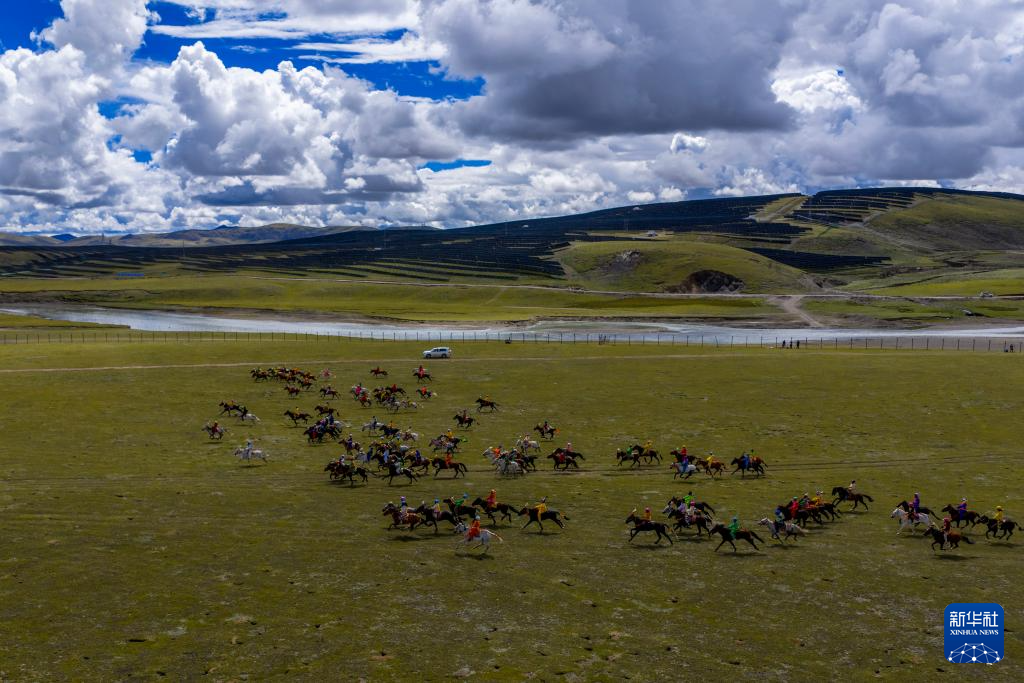 2025年那曲市恰青賽馬節(jié)上,騎手們在傳統(tǒng)大跑項目中馳騁(無人機照片,9月7日攝)。新華社記者 姜帆 攝