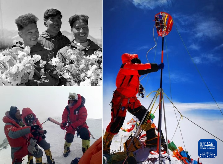 拼版照片:左上圖為1960年5月登上珠穆朗瑪峰峰頂?shù)闹袊巧疥犼爢T王富洲(右)、貢布(中)和屈銀華(資料照片,新華社發(fā));左下圖為2008年5月8日,北京奧運圣火珠峰傳遞登山隊隊員羅布占堆(左)點燃第一棒火炬手吉吉手中的“祥云”火炬(新華社發(fā));右圖為2020珠峰高程測量登山隊隊員在珠穆朗瑪峰峰頂開展測量工作(2020年5月27日,新華社特約記者 扎西次仁 攝)