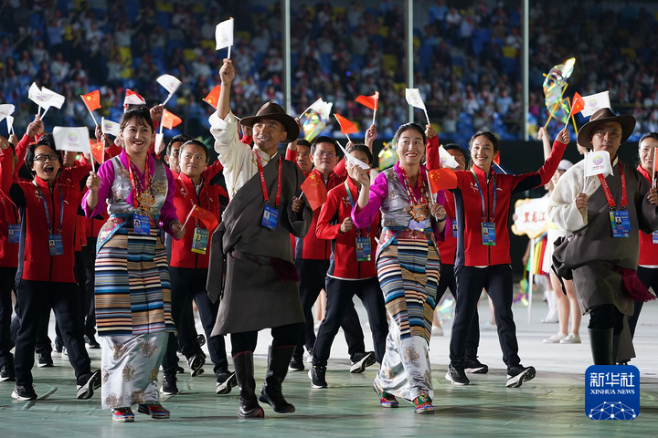 第十四屆全運會開幕式,西藏自治區(qū)體育代表團在入場儀式上(2021年9月15日攝)。新華社記者 彭子洋 攝